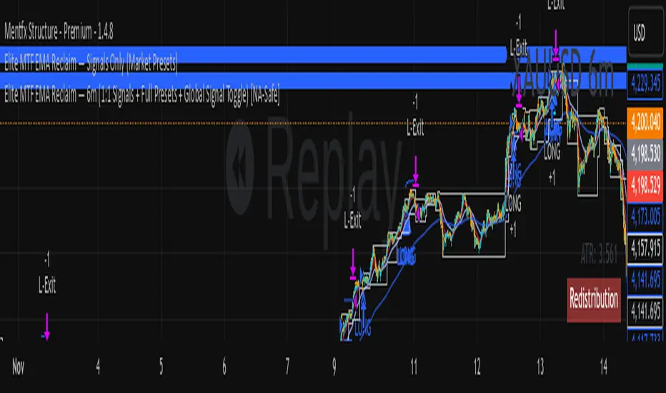This script is a 6-minute execution MTF EMA “retest → reclaim” strategy. It looks for trend-aligned pullbacks into fast EMAs, then enters when price reclaims and (optionally) retests the reclaim level—while filtering out chop (low trend strength/volatility or recent EMA20/50 crosses) and enforcing higher-timeframe alignment (Daily + 1H, or whichever you select).