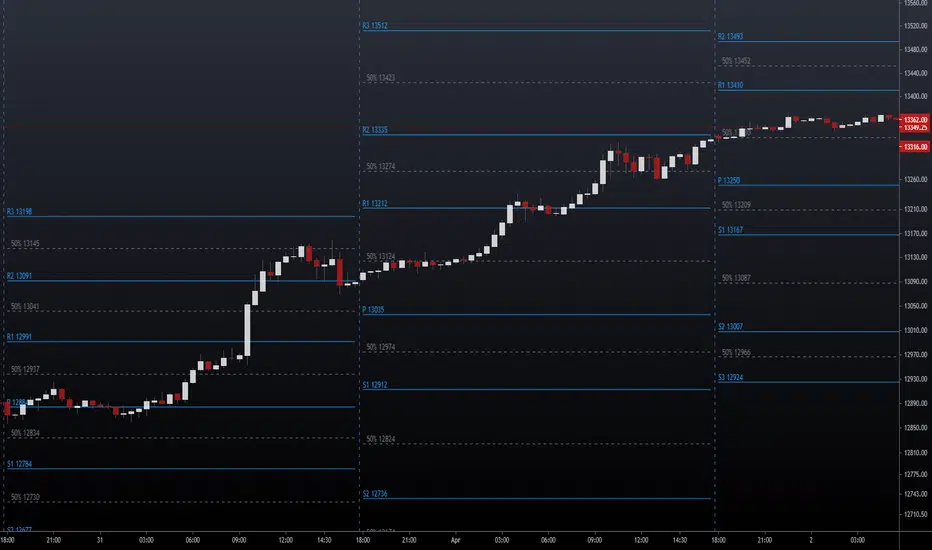 This script uses the Traditional Pivot Points but includes the price levels and the 50% line between levels. We added the ability to change the line color of the major levels and the minor levels independently, for better clarity. Added alerts - used code from QuantNomad.