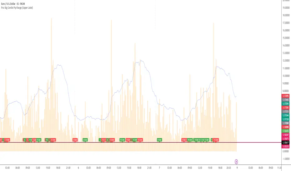 Highlights unusually large candles by calculating pip ranges dynamically based on recent volatility. Shows exact pip count above the candle, color-coded by direction (green bullish, red bearish). Features adaptive thresholds, optional histogram, and works on any instrument or timeframe. Ideal for scalpers and intraday traders spotting high-volatility candles quickly.