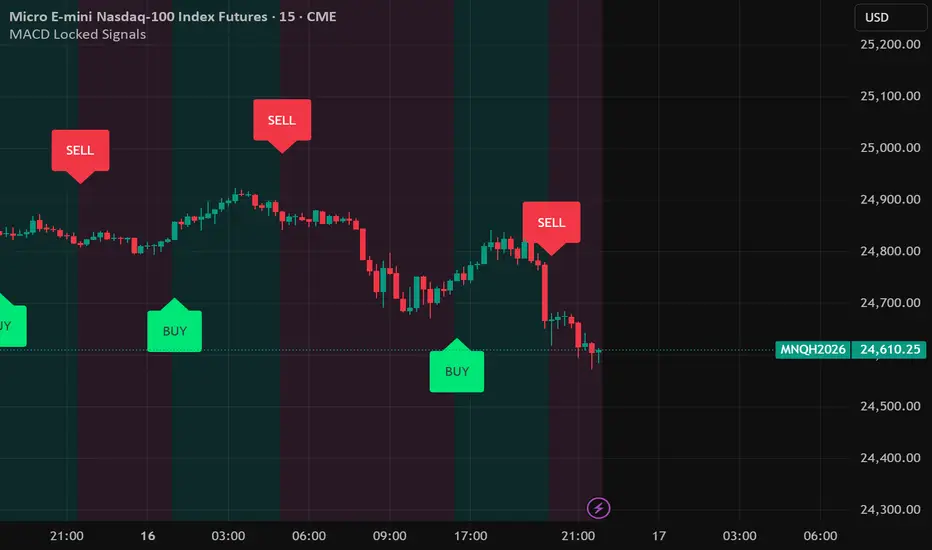 This indicator provides clear Buy and Sell signals based on the classic MACD strategy, enhanced with a **State Memory** system to prevent signal spamming and ensure signal stability.