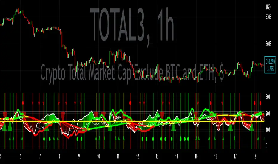 These lines are further averages of the normal RSI line, providing a smoother oscillating baseline. When the thick white line or thick red/green line crosses this baseline, it typically indicates a change in direction.