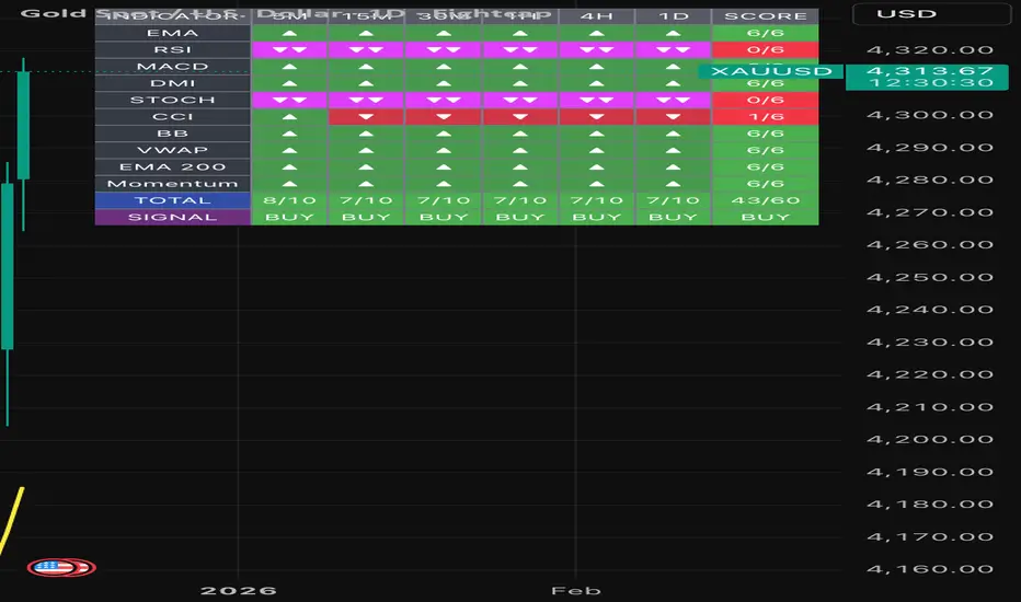 Shows 10 indicators across 6 timeframes (5M, 15M, 30M, 1H, 4H, 1D):