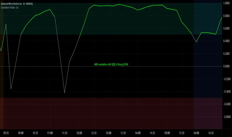 This indicator calculates the correlation between a selected ticker and an index over a user-defined period. It visualizes correlation with color-coded lines, thresholds, and a descriptive rating, helping traders quickly gauge the strength and direction of correlation.