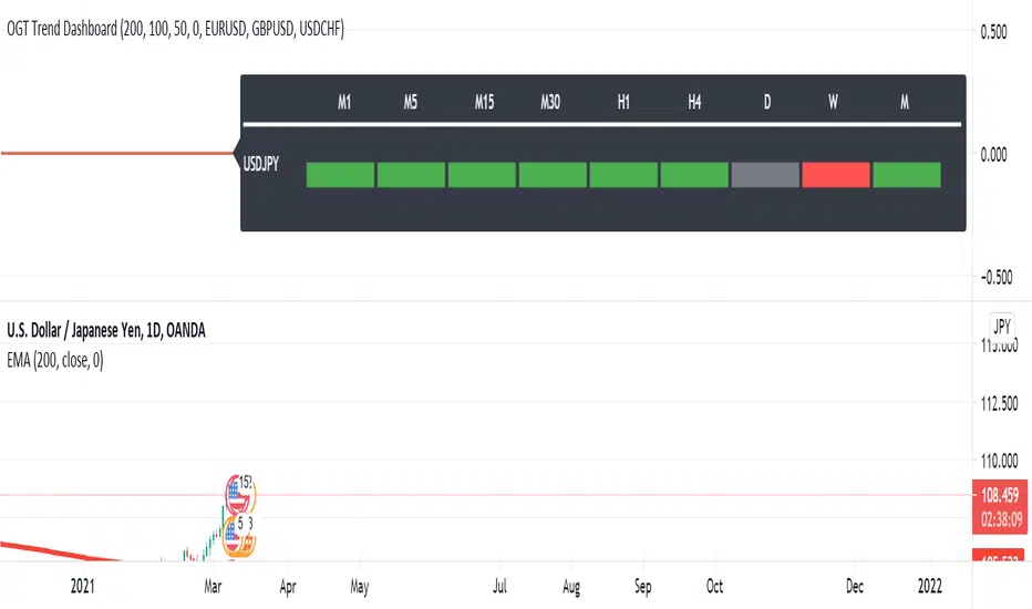 The One Glance Trader (OGT) Trend Dashboard is a trend indicator that visualises if a stock, currency pair etc. is trending (up/down) on multiple time frames. The aim of the dashboard is to provide a "one glance" view for a custom list of symbols to show a clear trend bias. A green timeframe signals it is in a up trend, red for a down trend and grey for no clear trend direction. The indicator uses 3 EMAs (fast, medium slow) to define whether a symbol is trending or ranging. The 3 EMAs periods can be defined by the user.