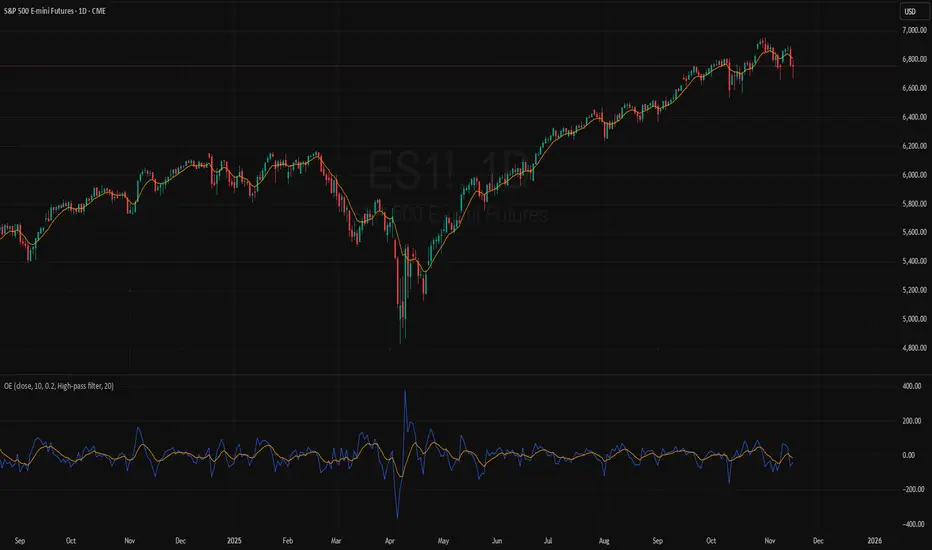 This script applies the One Euro filter to a specified source series, and it applies the filter to a two-pole high-pass filter or other oscillator, depending on the selected "Osc type" option. By default, it displays the filtered source series on the main chart pane, and it shows the oscillator and its filtered series in a separate pane.