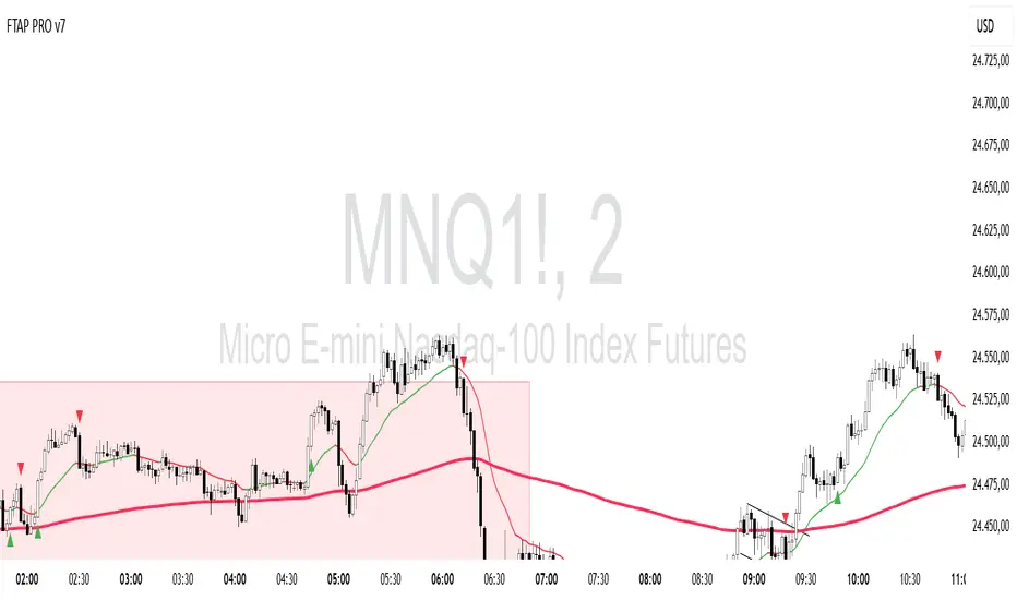 This indicator plots the 20- and 200-period exponential moving averages on the chart with a coloring rule and an entry signal based on the start bar of the FTAP method