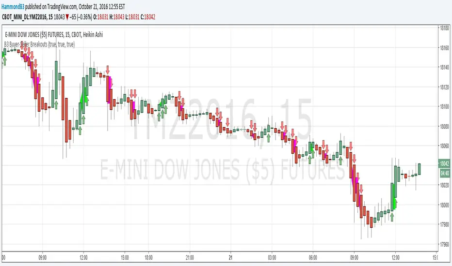 B3 Buyer-Seller Breakouts = If a bar is showing that it is moving in a direction with highs lows and close, all of which are >respectively< moving against the open from the bar before, then it prints indicating buyers or sellers bringing momentum. The arrows and cloud carry into the next bar to give lots of awareness of the micro-term momentum. The cloud represents the better price range from which to add to a position.