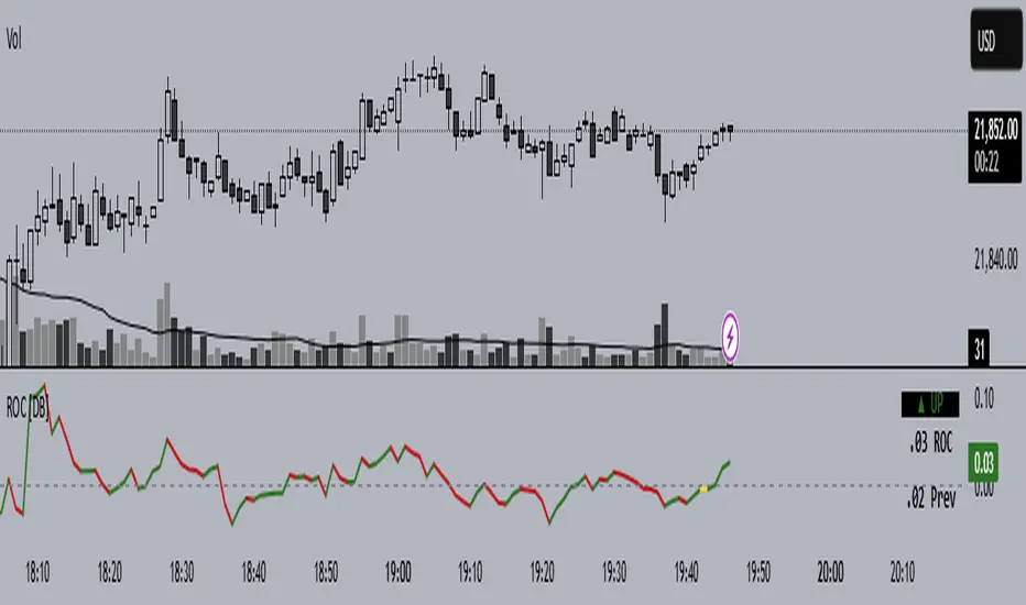 - Color-Coded Direction: ROC line changes color (green/red/yellow) based on intra-candle momentum shifts.