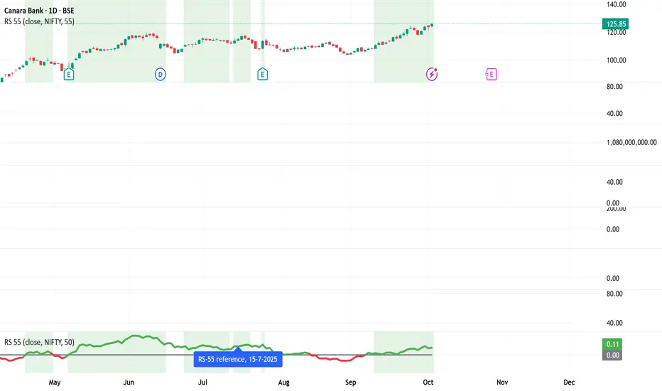 This indicator measures Relative Strength (RS) of the selected ticker against a comparative benchmark (default: NSE:NIFTY) over a fixed 55-period lookback. It helps identify whether the asset is outperforming or underperforming its benchmark.