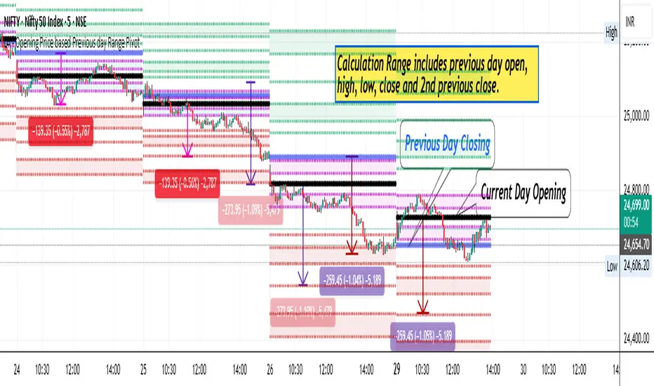 The core idea is inspired by concepts like the Opening Range Breakout (ORB) strategy or Fibonacci pivots, but it's customized here to use a dynamic range calculation (the maximum of several absolute price differences) rather than a simple high-low range. This makes it more robust for volatile markets. Levels are symmetric above (resistance) and below (support) the opening price, helping traders identify potential entry/exit points, stop-losses, or targets. This will be useful when there is a gap-up/down as in Nifty/Sensex.