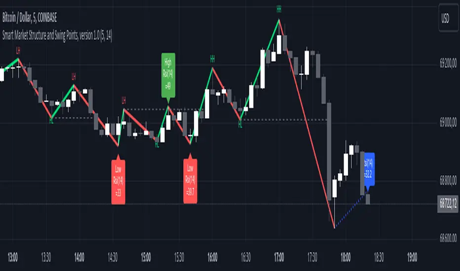 This script provides a detailed view of market structure and swing points, helping make more informed decisions by considering key highs and lows, trend direction changes, and the strength or weakness of swing points.