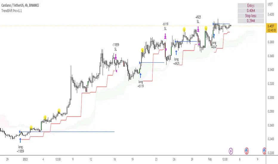 The indicator is optimized for the 4 hour timeframe. A green bullish or red bearish signal candle indicates there has been a meaningful shift towards the respective trend direction. When a long/short entry signal is given, that means the signal candle has been confirmed and a trade can be entered accordingly.
