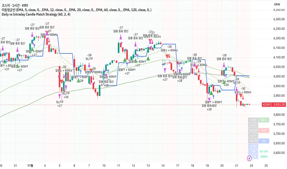 전일 종가 대비 현재 일봉 방향과 시간봉 방향이 일치할 때 진입