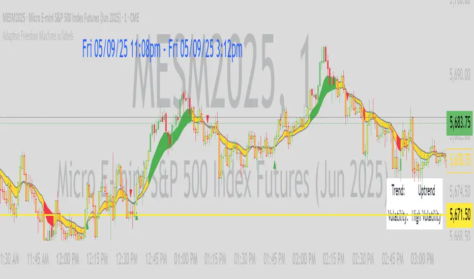 The Adaptive Freedom Machine w/ Labels is a versatile Pine Script indicator designed to assist traders in identifying buy and sell opportunities across various market conditions (trending, ranging, or volatile). It combines Exponential Moving Averages (EMAs), Relative Strength Index (RSI), Average True Range (ATR), and customizable time filters to generate actionable signals. The indicator overlays on the price chart, displaying EMAs, a dynamic cloud, scaled RSI levels, buy/sell signals, and market condition labels, making it suitable for swing trading, day trading, or scalping.