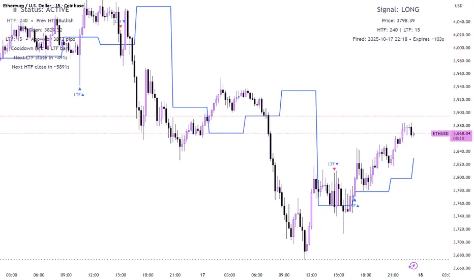 Smart HTF–LTF Sync Alert is a precision multi-timeframe alert system that synchronises higher-timeframe (HTF) structure with lower-timeframe (LTF) confirmation.
