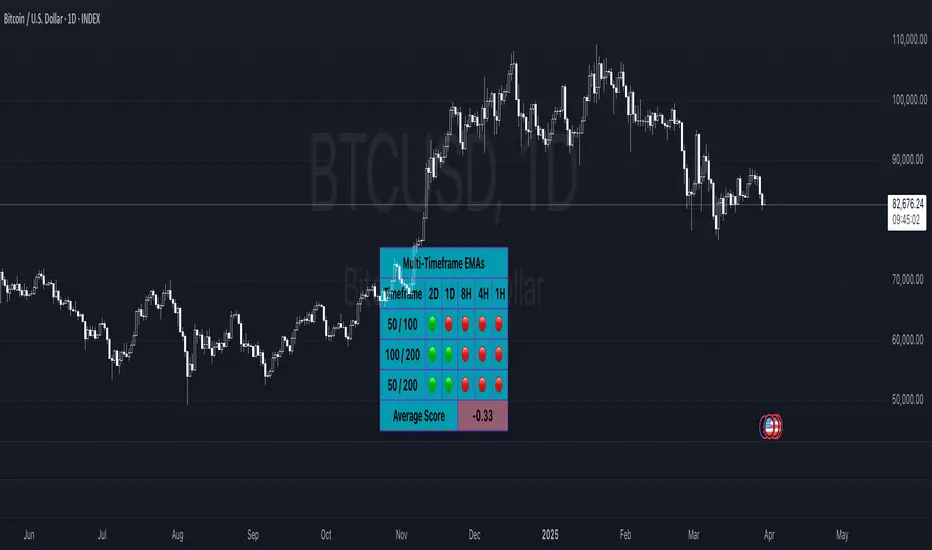 The 'Multi-Timeframe EMA Band Comparison' indicator is a tool designed to analyze trend direction across multiple timeframes using Exponential Moving Averages. it calculates the 50, 100, and 200 period EMAs for fiver user defined timeframes and compares their relationships to provide a visual snapshot of bullish or bearish momentum.