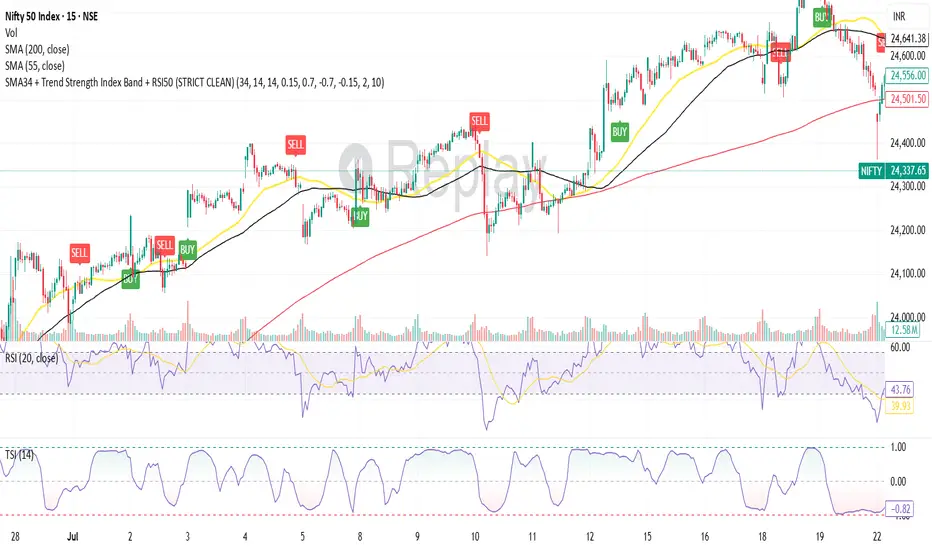 SMA34 + Trend Strength Index Band + RSI50 (STRICT CLEAN)
