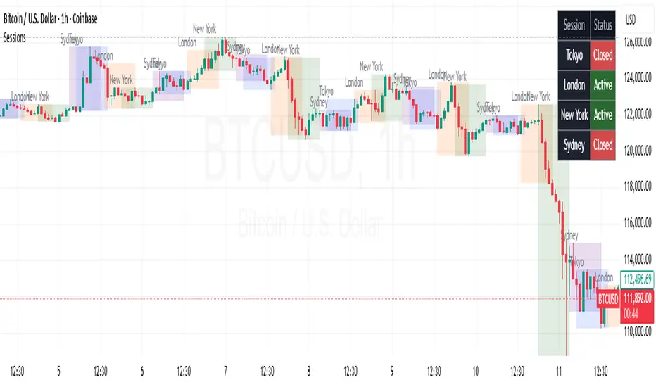 This is a trading sessions indicator for TradingView (Pine Script v5) that visually highlights different forex market trading sessions on your chart with colored boxes and provides a real-time status dashboard.