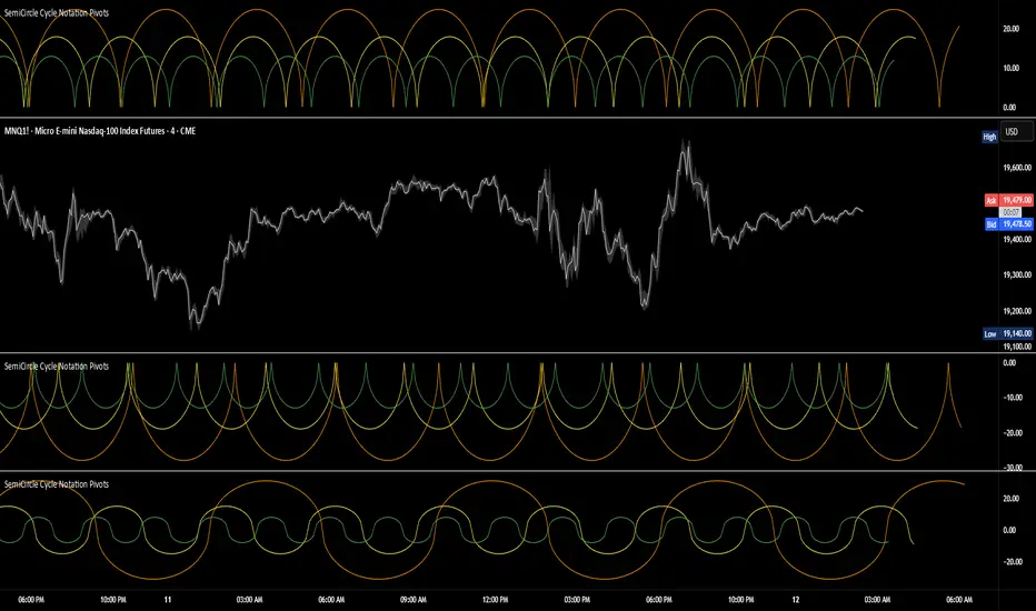 This is where SemiCircle Cycle Notation Pivots indicator comes in. Semicircle cycle chart notation appears to have evolved as a practical visualization tool among cycle theorists rather than being pioneered by a single individual; some key influences include HM Gartley, WD Gann, JM Hurst, Walter Bressert, and RayTomes. Built upon LonesomeTheBlue's foundational ZigZag Waves indicator, this indicator takes cycle visualization to the next level by dynamically detecting price pivots and then automatically plotting semicircles based on real-time cycle length calculations & expected rhythm of price action over time.