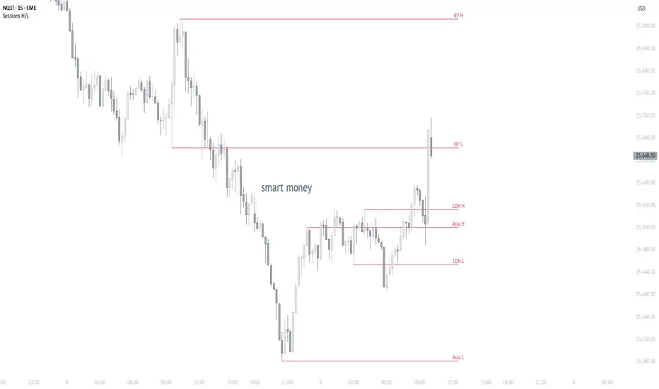 Automatically plots high & low levels for multiple sessions. Clear session structure for intraday traders using price action, liquidity concepts, or session-based strategies.
