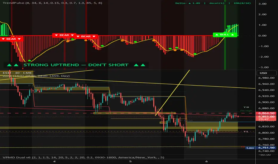 A context-aware trend strength and momentum indicator designed for active traders who need to know not just which way the trend is going, but how hard it's pushing and whether it's still accelerating or running out of gas.