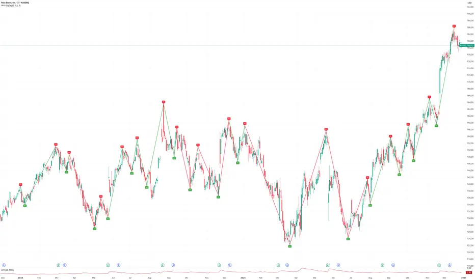 This indicator plots a wick-based ZigZag where swing points are confirmed by a minimum counter-move (ATR multiple) and a minimum number of bars between swings. Confirmed swing highs are labeled P2, swing lows P3. Optional IDs, labels, and a trend-colored ZigZag line. - Wick-based ZigZag (High/Low wicks)