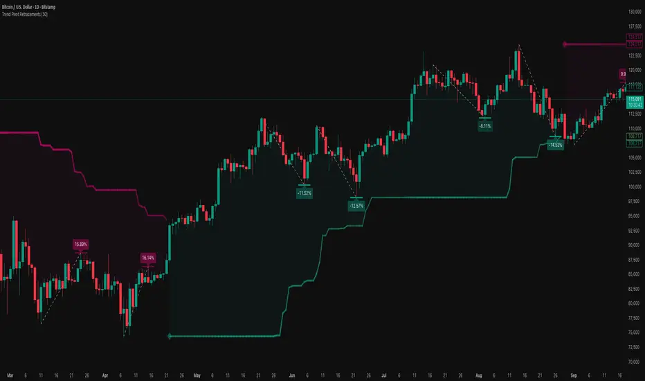 Trend Pivot Retracements [TradeEasy] identifies market trend direction using a Donchian-style channel and dynamically highlights retracement zones during trending conditions. It calculates the percentage pullbacks from recent highs and lows, plots labeled zones with varying intensity, and visually connects key retracement pivots. The indicator also emphasizes price proximity to trend boundaries by dynamically adjusting the thickness of plotted trend bands.