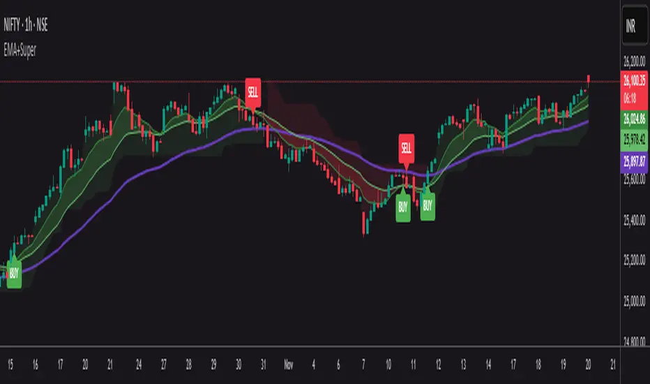 This indicator integrates multiple trend-following components into a unified, clean, and easy-to-interpret chart overlay. Its purpose is to help traders observe short-term and long-term trend direction, momentum shifts, and potential areas of interest using established moving-average and volatility-based techniques.