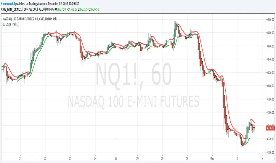 B3 Edge Trail is similar to a SuperTrend or ATR stopline system. It is based on the average of the highs and lows, and when back-broken, the binary bias flips. Simple as pie to use, just set your input to whatever suits your chart. The more "bars back" length the less flipping, then if you lower that input number it will result in an increase in sensitivity.