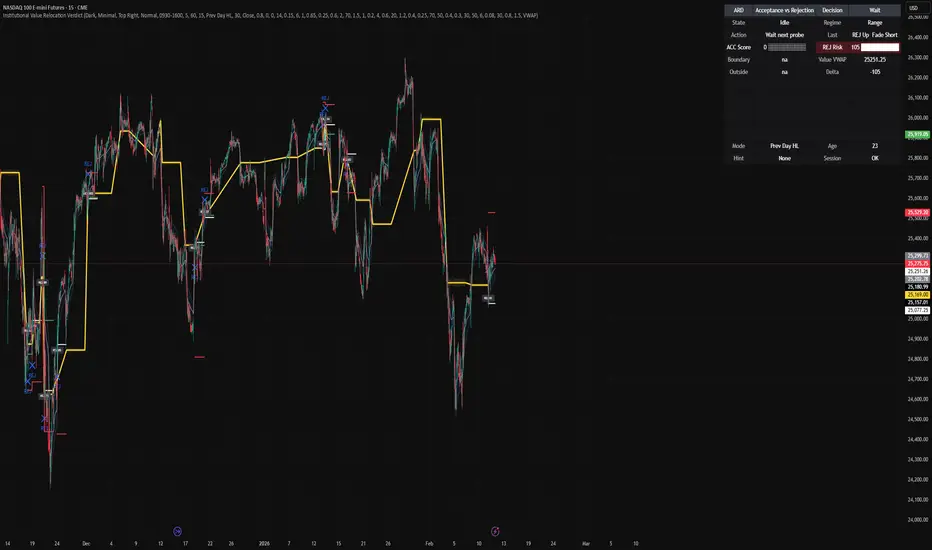 Value Relocation Verdict ARD is an acceptance versus rejection classifier for liquid instruments on intraday to daily timeframes. It helps you act only when multiple conditions align after price pushes beyond a boundary. It is original because it treats every break as a probe and scores whether value is relocating using a break anchored VWAP relocation metric fused with time outside, extension, outside volume share, pullback quality, and failure velocity back into value. Add it to a clean chart, read the compact decision table, and use the visuals or alerts. Shapes can move while the bar is open and settle on close. For conservative alerts select on bar close.