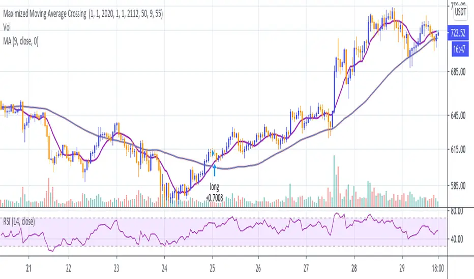 - Buy condition: the MA9 crosses above the MA50, and at the same time, the RSI has a value greater than 55.