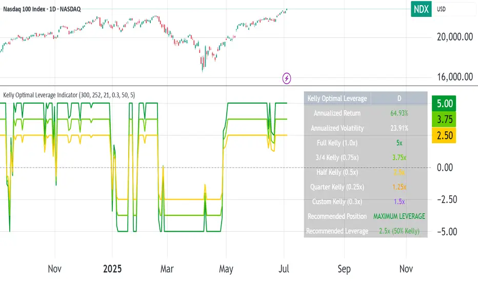 The Kelly Optimal Leverage Indicator mathematically applies Kelly Criterion to determine optimal position sizing based on market conditions.