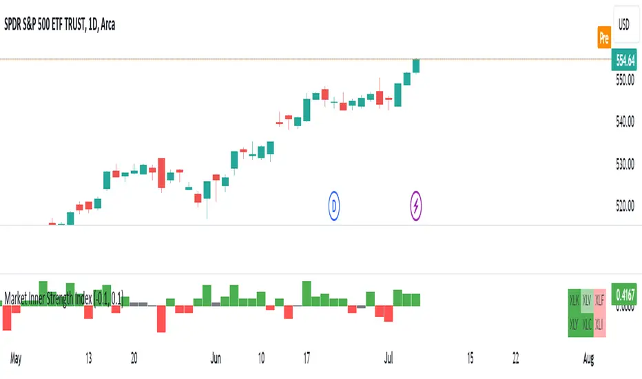 The "Market Inner Strength Index" is an indicator designed to visually represent the market strength by analyzing the six major sectors: XLK, XLV, XLF, XLY, XLC and XLI. These sectors represent more than 80% of the SPX index, making their performance crucial for understanding overall market conditions. The indicator calculates the individual strengths of these sectors and combines them to provide an overall market strength index, helping to identify scenarios of sector rotation, euphoria, or panic.