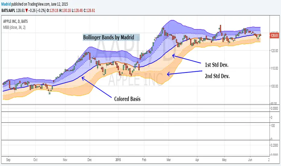 This displays the traditional Bollinger Bands, the difference is that the 1st and 2nd StdDev are outlined with two colors and two different levels, one for each Standard Deviation.