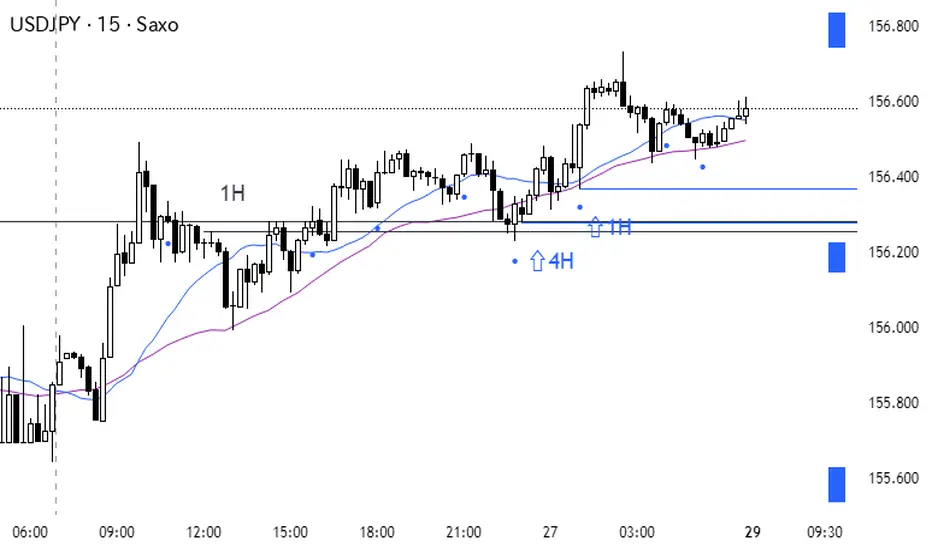 1時間足と15分足の構造を比較します。ここが「青」に変わる瞬間が、エントリーの準備段階です。