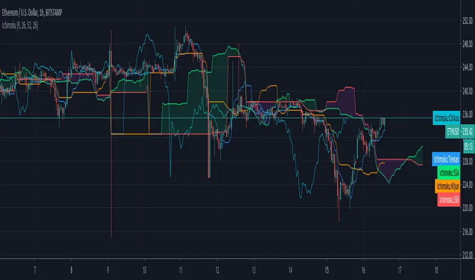 This is the Ichimoku Kinko Hyo indicator, using colorblind friendly colors as much as possible so that every line or cloud trend can be identified more easily. It is correctly visible both in bright and dark mode.
