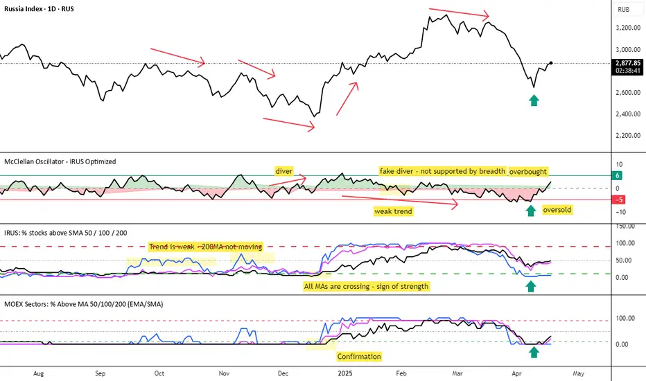 Overlay this indicator on the IMOEX index chart to detect narrow leadership