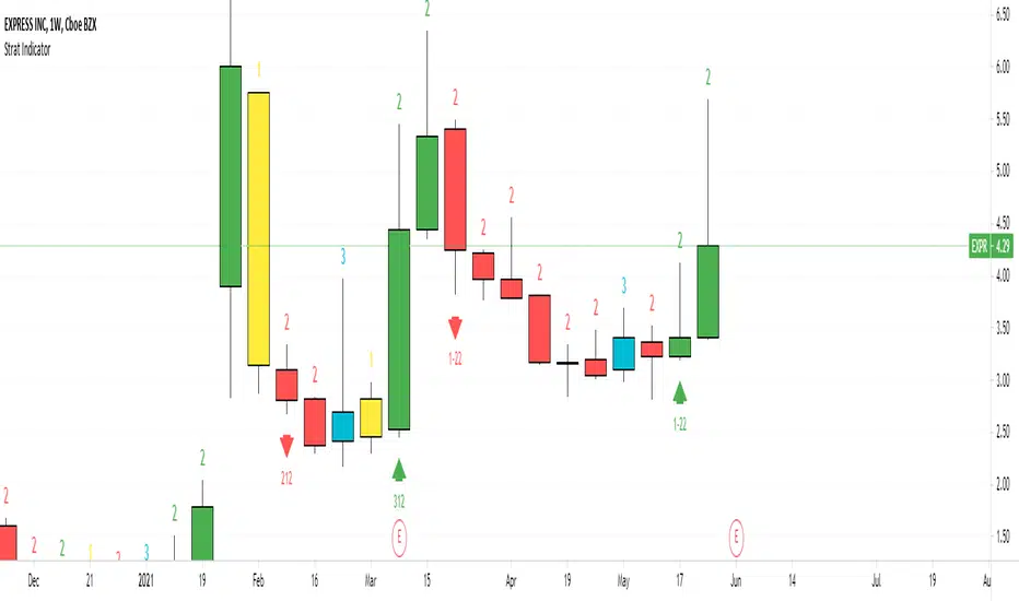The bullish , bearish and continuation patterns are labelled with the relevant strat combination