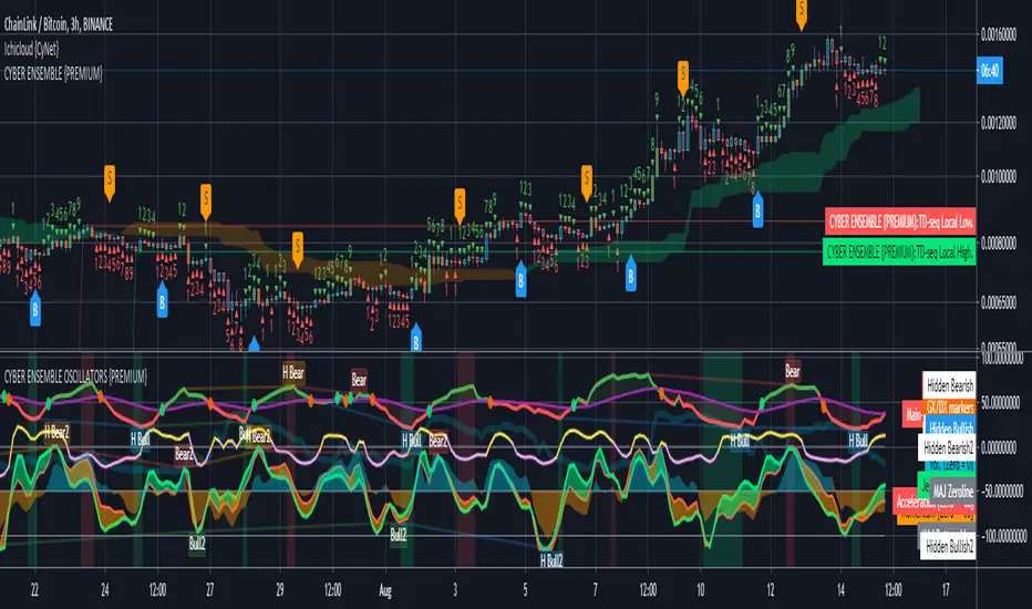 It is based on the algorithms powering the PRISM OSCILLATORS SET, where instead of the pRSI, the main-oscillator (main-osc) is instead powered by an oscillator modulated by the sophisticated scoring engine of the CYBER ENSEMBLE buy/sell indicator.