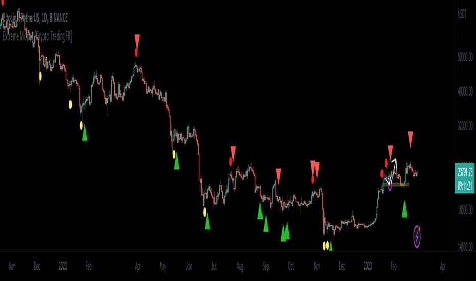 The algorithm shows the turning points in the market and uses multiple filters to present the best potential turning points. Although this is its core functionality, Extreme Money also incorporates a series of popular other indicators (see below) allowing full identification of trends on the chart.