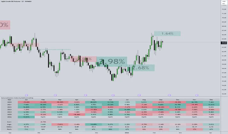 This indicator visualizes historical seasonality patterns over a customizable time range. It displays how each month has performed historically, allowing traders to quickly identify recurring seasonal tendencies.