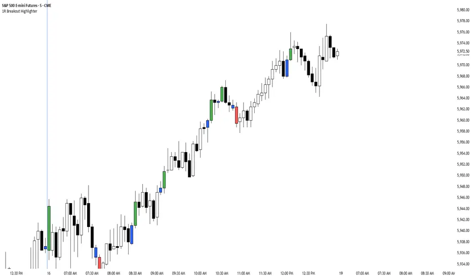 Highlights breakout momentum bars and their reference bars using the previous bar’s range (1R). Colors the current bar green or red when price moves a user-defined multiple of the prior bar’s range above the high (bull breakout) or below the low (bear breakout). The reference (previous) bar is marked blue when a breakout occurs. Useful for visualizing 1R volatility and breakout behavior in real time.Skrypt open-source