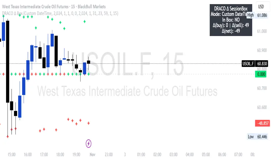 The DRACO Delta SessionBox is an advanced visual and analytical tool designed to measure and display cumulative buying and selling pressure (Δ — delta) within a user-defined time window, such as a specific custom date range, a recurring monthly period, or the entire current month.