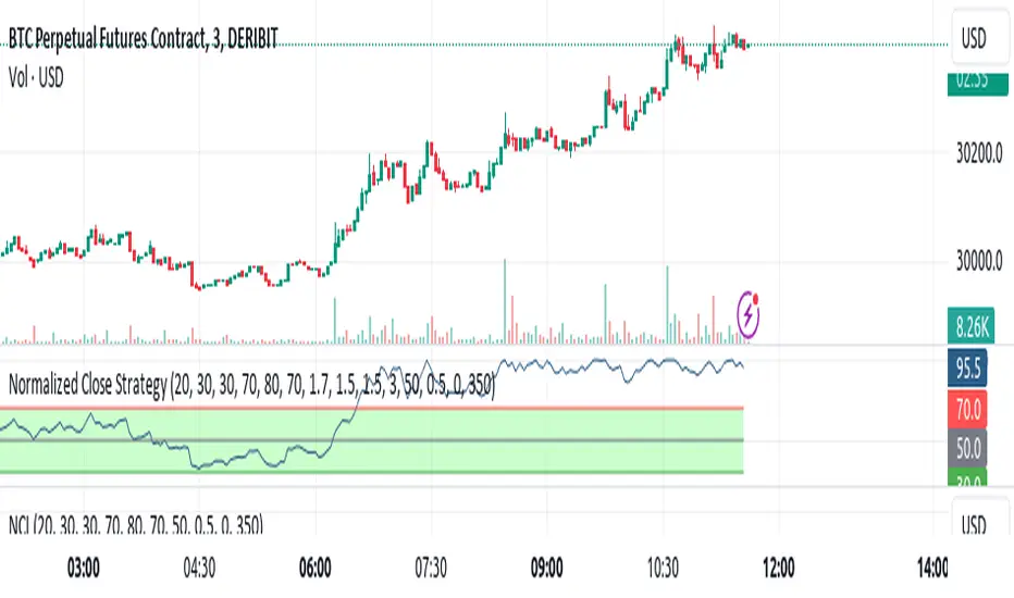 The central aspect of this indicator is the computation of a normalized close price. The normalized close price is computed by first determining the highest and lowest closing prices over a specified historical period. This highest and lowest value form the boundaries of the historical price range.