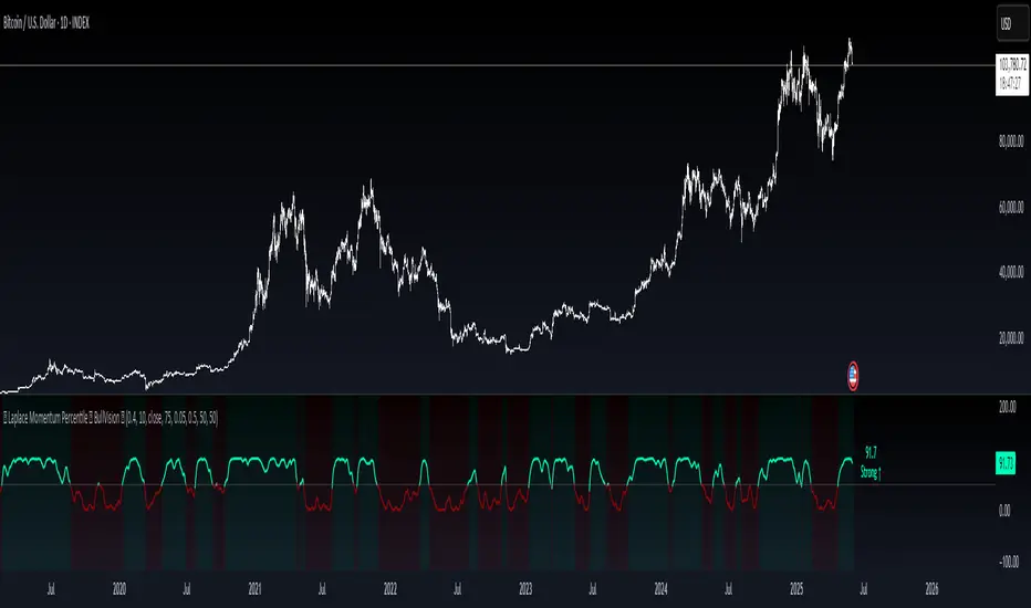 Laplace Momentum Percentile ║ BullVision is a custom-built trend analysis tool that applies Laplace-inspired smoothing to price action and maps the result to a historical percentile scale. This provides a contextual view of trend intensity, with optional signal refinement using a Kalman filter.