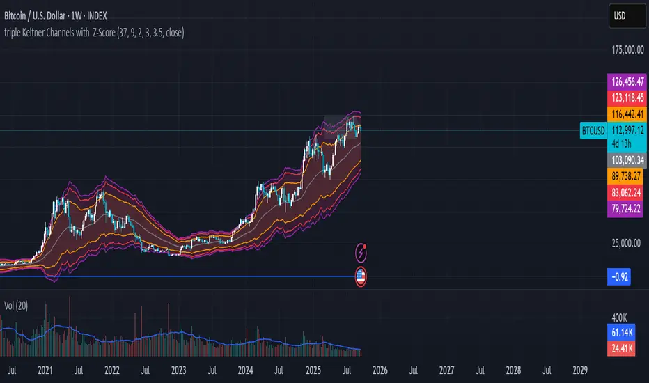This script expands on the classic Keltner Channel by plotting three adaptive volatility bands around an EMA baseline and introducing a dynamic Z-Score calculation to quantify price positioning within or beyond those bands.