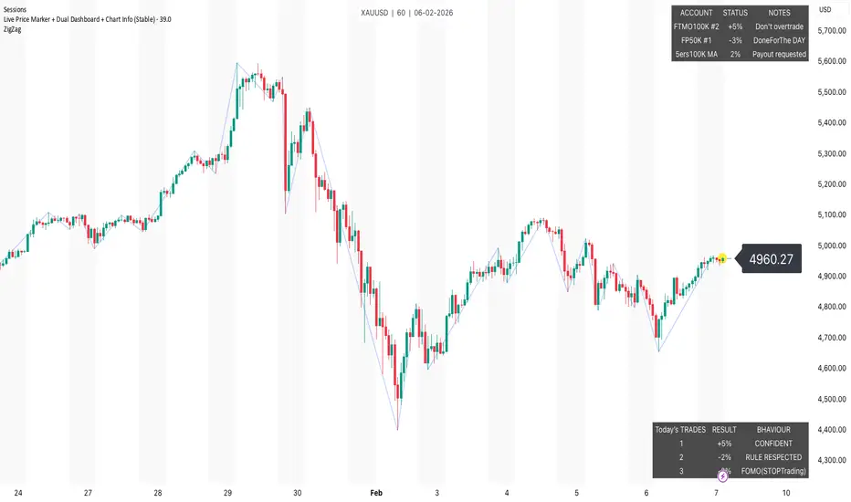 A lightweight, distraction-free trading utility built for price-action and prop-firm traders.This script combines a live price marker, a fully customizable trader dashboard, and a fixed chart-info panel—all anchored to the chart so nothing moves with price.