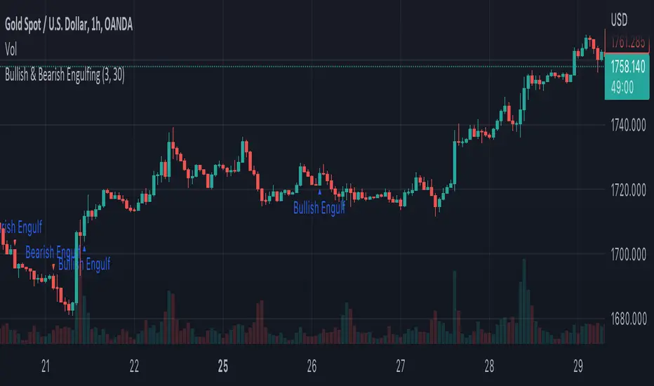 A simple script to filter out bullish and bearish engulfing candles. Size of candles can be filtered.