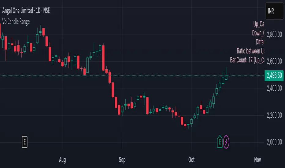 The “VolCandle_Start_End Bars” Pine Script is a custom TradingView indicator designed to calculate and display volume-based candle statistics between two user-defined time points. It visually summarizes trading activity across a specific date range by comparing up-candle and down-candle volumes.