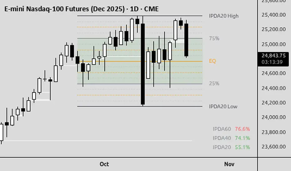The **IPDA Ranges – Pro** indicator brings the core concepts of the Interbank Price Delivery Algorithm (IPDA) from ICT (Inner Circle Trader) mentorship to life on TradingView. Inspired by ICT's foundational video on [The IPDA Model](youtube.com/watch?v=043OW8trIJE), this tool visualizes multi-period price ranges (20, 40, or 60 days) to decode institutional order flow, identify discount/premium zones, and highlight algorithmic price delivery points.
